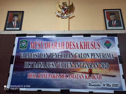 Musyawarah Desa (Musdes) Tentang Pembagian Bantuan Langsung Tunai (BLT) Dana Desa (DD) dilaksanakan pada hari Kamis Tanggal 14 Mei 2020 bertempat di Balai Desa Ranupakis dihadiri oleh seluruh Ketua RW di Desa Ranupakis